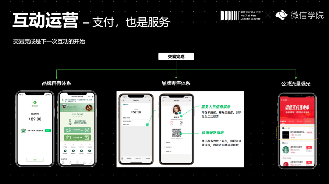 在支付完成页,微信提供了跳转小程序商城、展示导购员名片等能力,通过更加直观和方便的方式来让消费者在买单之后仍然可以跟品牌建立一定的联系,而且是比较自然的方式。
